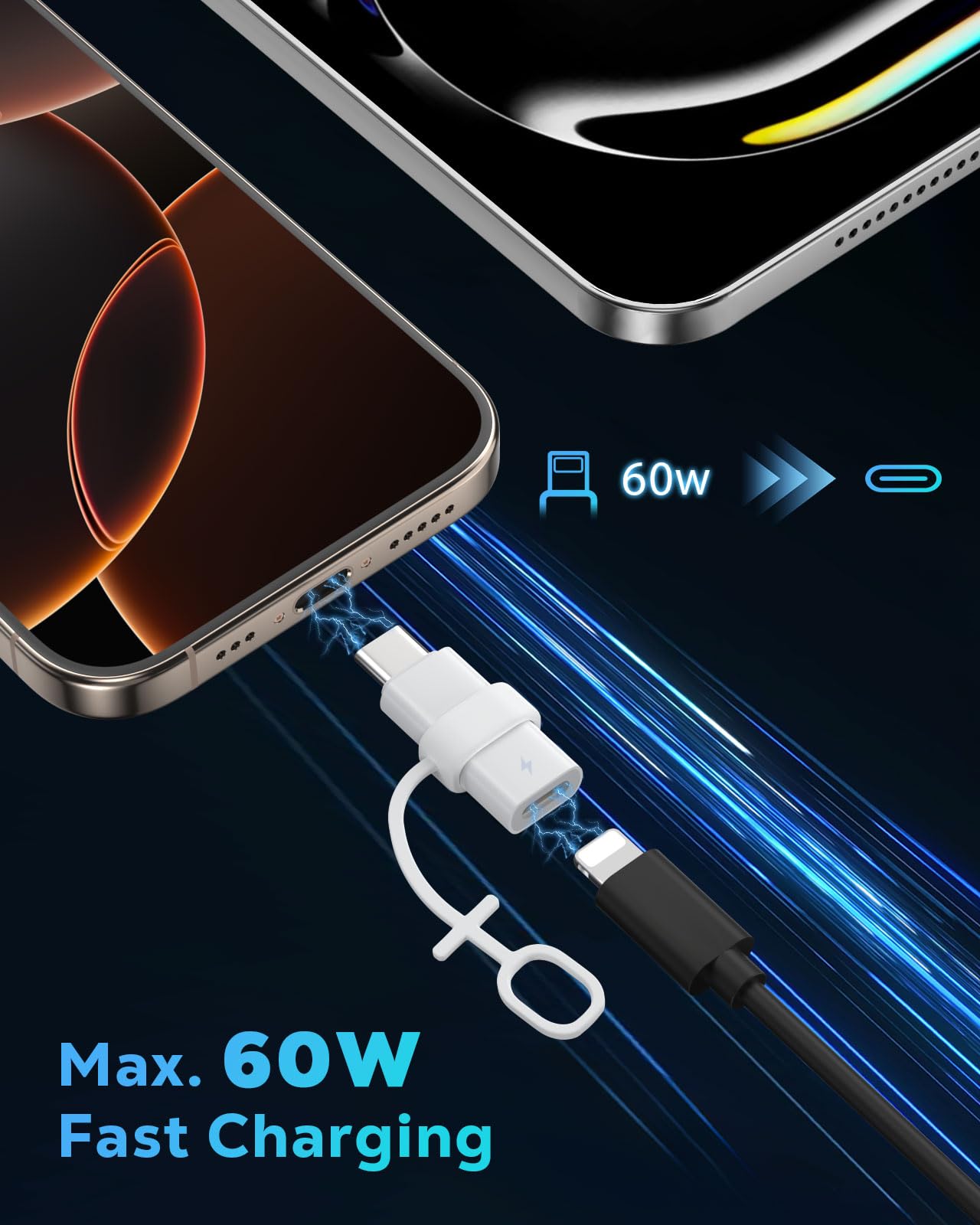 - 60W Fast Charging and Data Transfer: Our Lightning to USB C adapter provides 60W fast charging and 480 Mbps data transfer for phones, tablets, laptops, and other devices, ideal for efficient office work and convenient life. Make your iPhone or iPad directly compatible with Lightning to USB-A data cable and Lightning to USB-C data cable. Save the hassle of carrying extra data cables.